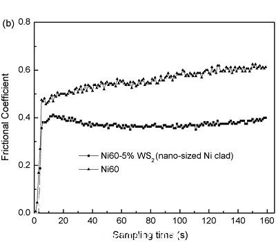 圖1為熔覆層的組織形貌,可以看出熔覆層內(nèi)存在大量納米尺度的h-WS2和WC相,其摩擦磨損結(jié)果見(jiàn)圖2所示。
