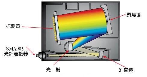 實驗所用的光纖光譜儀(見圖1和圖2)采用Czerny-Turner對稱式光路設(shè)計,入射焦距和色散焦距都是75mm;其包括光纖接頭(標準SMA接口,也可以選擇其他類型的接口)、準直鏡、衍射光柵、聚焦鏡和線陣CCD探測器,波長范圍為200~1100nm,最高分辨率為0.025nm,提供USB2.0、RS-232和I/O接口。