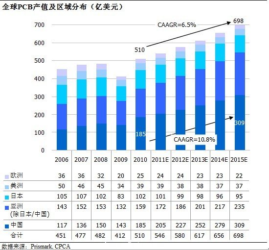 根據(jù)Prismark 預(yù)測(cè),2011年全球PCB產(chǎn)值增速將達(dá)7.0%,達(dá)到546億美元。2011年~2015年期間,全球PCB將保持6.5%的速度穩(wěn)定增長(zhǎng),在2015年整體規(guī)模將有望達(dá)到698億美元。
