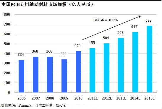 對(duì)于中國(guó)市場(chǎng),2010年,國(guó)內(nèi)PCB輔助材料的規(guī)模為424億人民幣,并將以年均10.0%的速度增長(zhǎng),到2015年,中國(guó)PCB輔助材料規(guī)模將達(dá)到683億元。增長(zhǎng)速度與PCB行業(yè)水平相當(dāng)。