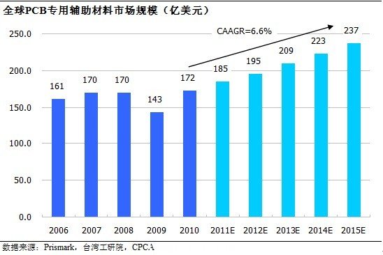 2010年,全球PCB輔助材料的規(guī)模為172億美元,受益于PCB大行業(yè)的增長(zhǎng),2015年市場(chǎng)規(guī)模將增長(zhǎng)到237億美元,2010年~2015年期間年均復(fù)合增長(zhǎng)率為6.6%,與PCB產(chǎn)值保持一致水平。