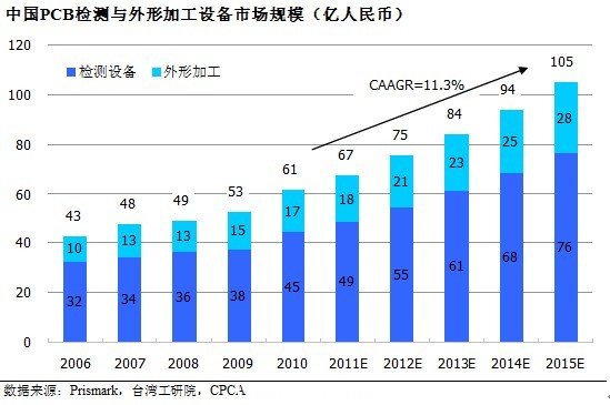 2010年,全球PCB檢測(cè)及外形加工設(shè)備規(guī)模達(dá)到25億美元,并將在2015年增長(zhǎng)到36億美元,年均復(fù)合增長(zhǎng)率為7.8%。