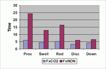圖1:點(diǎn)陣式剝脫CO2激光(FxCO2)及點(diǎn)陣式光熱作用非剝脫激光(FxNON)嫩膚治療的操作(Proc)、腫脹(Swell)、紅斑(Red)、不適(Disc)及休息時(shí)間(Down)的平均時(shí)間,除操作時(shí)間單位為分鐘以外,其它所有時(shí)間的單位為天。操作時(shí)間為每種激光儀單次治療的時(shí)間。在所有的受試者中,F(xiàn)xCO2的時(shí)間均更短。