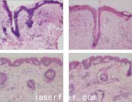 圖3:在治療前(左側(cè))及結(jié)束治療后6月(右側(cè))取活檢標(biāo)本制作組織學(xué)切片,受試者一側(cè)面部接受單次點(diǎn)陣式剝脫CO2激光治療(上排),另一側(cè)面部接受5次點(diǎn)陣式非剝脫激光治療(下排)。顯微學(xué)下分析表明CO2激光治療后新膠原有30%的增加,非剝脫激光治療后新膠原增加僅為15%。切片由病理學(xué)家Justin H. Ekuan, M.D.及AlirezaTafazzoli, M.D.來評(píng)價(jià),照相由James A. Heinrich, M.D負(fù)責(zé)。