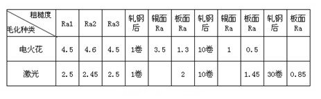2)輥、板轉(zhuǎn)化率一二般凹坑為20%,凸臺(tái)為80%。也就是說軋輥的粗糙度值反映到薄板上的粗糙度值,在很大程度上取決于軋輥毛化凸臺(tái)的高度、強(qiáng)度,激光毛化凸臺(tái)可在側(cè)吹氣體作用下盡量提高。