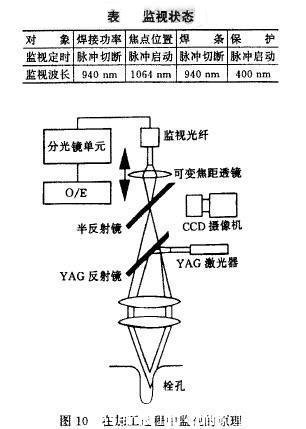 圖6 板厚20mm配管的YAG激光焊接結(jié)果圖10示出監(jiān)視頭的構(gòu)成。監(jiān)視時(shí),以光軸和同軸抽出焊接狀況的圖像,同時(shí)分光、探測焊接部的發(fā)光。為了使熔深加深,采用脈沖振蕩。根據(jù)焊接狀況圖像,對熔池形狀和焊接坡口線位置進(jìn)行圖像處理,并向操作人員提供視覺信息。焊接部的發(fā)光抽出,與以前所實(shí)施的采用多條監(jiān)視光纖的方法對應(yīng),因?yàn)楹附宇^所要求的空間制約條件并不嚴(yán)格,用一根監(jiān)視光纖把用半反射鏡分出的光抽出。下表中示出焊接部發(fā)光的抽出方法。這里采用的是在抽出焊接參數(shù)、激光器輸出、焦點(diǎn)位置變化的同時(shí),探測穿透焊接時(shí)內(nèi)部波穩(wěn)定性和焊接保護(hù)狀況。