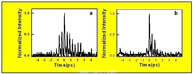 圖3 主壓縮器近轉(zhuǎn)換極限壓縮脈沖(a)1ps和(b)500fs輸出