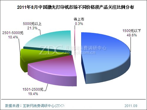 在選擇激光打印機(jī)產(chǎn)品的用戶中,多數(shù)是企業(yè)客戶,而且對(duì)于產(chǎn)品的性價(jià)比有著較高的要求。2011年8月,中國激光打印機(jī)市場中不同價(jià)格段的產(chǎn)品中,1500元以下產(chǎn)品關(guān)注度高達(dá)48.6%,1501-2500元之間產(chǎn)品的關(guān)注度為19.4%,兩者關(guān)注比例之和接近70%,由此可見,中低端產(chǎn)品的人氣較高。