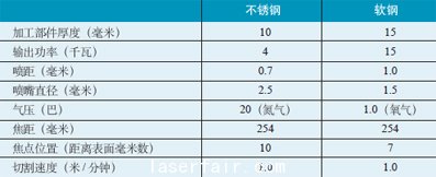 光纖激光器切割在切割薄型金屬的時候,相比CO2激光器有明顯的速度優(yōu)勢,如圖1所示。從圖2和圖3中可以看出,在所標(biāo)明的切割速度下,光纖激光器切割比CO2激光器所需要的功率要低,說明工件材料所吸收的光纖激光器光束更多,從而提高光纖激光器光束的融化速度。表1中呈現(xiàn)的是圖2和圖3光纖激光系統(tǒng)應(yīng)用中的規(guī)格。光纖激光器的速度優(yōu)勢在切割厚型金屬的時候并不明顯。對于較大的工件厚度(大于4毫米),光纖激光器切割速度下降到一個相當(dāng)于CO2激光器切割速度的水平。從本質(zhì)上講,光纖激光器切割大型厚工件的速度大幅下降,主要歸因于光纖激光器輻射的吸收機制。金屬部件對光纖激光器輻射的吸收性在其厚度較小的時候達(dá)到最高值,隨之變厚時而下降;相反CO2激光器的輻射吸收性隨著加工金屬部件的厚度增加而增強,在加工部件厚度達(dá)到最高的時候吸收性也隨之達(dá)到最高值。