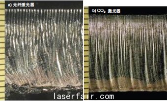 圖4顯示了使用類似加工參數(shù)的光纖激光器和CO2激光器在加工10毫米厚的不銹鋼中獲得的典型切割邊緣質(zhì)量。與光纖激光器相比,CO2激光器可獲得更卓越的切割邊緣質(zhì)量。利用高光度的光纖激光器在高速切割厚型鋼材時產(chǎn)生的狹窄切縫實現(xiàn)有效的熔融噴射是有難度的,結(jié)果造成切割邊緣質(zhì)量的下降。