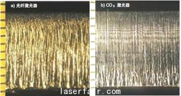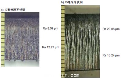 圖4顯示了使用類似加工參數(shù)的光纖激光器和CO2激光器在加工10毫米厚的不銹鋼中獲得的典型切割邊緣質(zhì)量。與光纖激光器相比,CO2激光器可獲得更卓越的切割邊緣質(zhì)量。利用高光度的光纖激光器在高速切割厚型鋼材時(shí)產(chǎn)生的狹窄切縫實(shí)現(xiàn)有效的熔融噴射是有難度的,結(jié)果造成切割邊緣質(zhì)量的下降。