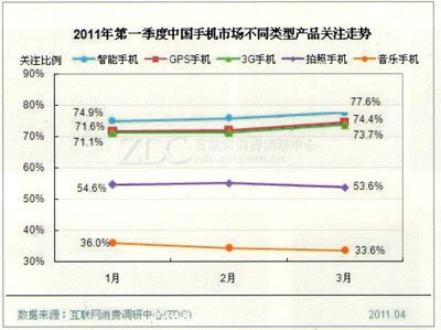 2010年,智能手機(jī)成為關(guān)注的焦點(diǎn)。Gartner統(tǒng)計(jì)數(shù)據(jù)顯示,2010年第一季度,全球普通手機(jī)銷量為3.147億部,同比增長(zhǎng)17%,而智能手 機(jī)銷量同比增長(zhǎng)48.790,達(dá)5430萬(wàn)部。第二季度,全球智能手機(jī)銷量達(dá)6165萬(wàn)部,同比增長(zhǎng)50%。2010年底,智能手機(jī)用戶突破1.5億。 2011年第一季度,智能手機(jī)關(guān)注比例在中國(guó)高達(dá)76.1%(見下圖)。從第一季度的走勢(shì)來(lái)看,智能、GPs、3G手機(jī)用戶關(guān)注度呈穩(wěn)步上升走勢(shì),智能手 機(jī)已經(jīng)成為用戶關(guān)注的絕對(duì)主流。有消息稱,2011年全球智能手機(jī)出貨量成長(zhǎng)幅度將達(dá)33.8%,其中亞洲地區(qū)占全球手機(jī)出貨比重達(dá)27.8%,將取代北 美的27%,成為全球智能手機(jī)出貨量的最大的區(qū)域,而中國(guó)大陸2011年更可望賣出1億部以上的智能手機(jī)。有專家預(yù)測(cè),智能手機(jī)將以每年50%的速度提 升。這意味著到2014年,中國(guó)將有一半以上的手機(jī)用戶使用智能手機(jī)終端。