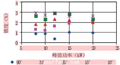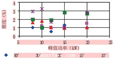 圖9和圖10 表示了兩種激光器分別在2mm厚的材料上加工不同角度孔的典型錐度。雖然兩種系統(tǒng)產(chǎn)生的錐度非常相似,但是可以看出,使用光纖傳輸系統(tǒng)加工出孔的圓度要比使用光束傳輸系統(tǒng)加工出的要好,因?yàn)楣饫w能使激光分布更均勻。圖11展示了用兩種激光器加工出的孔的截面,可以看出,用兩種激光加工出的垂直孔的錐度在深度方向并不一樣,尤其是在孔的中心位置變化很大,圖示反饋給我們的由于激光參數(shù)導(dǎo)致的錐度差異,激光峰值功率密度對(duì)孔形狀的影響。如今的研究表明,表面凸度的產(chǎn)生,主要是在孔的中心部位,而且更多的是發(fā)生在高能量密度的情況下。由此推測(cè),可能是因?yàn)榈入x子體的形成明顯地減少了在孔成形的過(guò)程中蒸發(fā)帶走物質(zhì)的作用。在表面上加工一個(gè)銳角的孔時(shí)沒(méi)有表面凸起產(chǎn)生,可能是因?yàn)楣獍咴谝粋€(gè)角度被拉長(zhǎng),而使能量密度減弱的緣故。