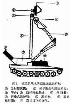 德國MBB和DIEHL公司自70年代初就開始研究防空激光武器方案,采用平均輸出功率1MW或幾MW的氣動CO2激光器。這種激光武器系統(tǒng)重約20噸,安裝在“豹-Ⅱ”坦克底座上,一般由2個人操縱即可。一個長約11.5m的升降臂,可將發(fā)射光學(xué)系統(tǒng)升至高處,以減少地面稠密大氣或戰(zhàn)場灰塵影響。樣機(jī)如圖1。根據(jù)設(shè)計(jì),每秒射擊一次(成本約300美元)。發(fā)射出的強(qiáng)光束可破壞10km內(nèi)的來襲飛機(jī)、直升機(jī)、戰(zhàn)術(shù)導(dǎo)彈等,并可致盲20km或更遠(yuǎn)的光電傳感器[6]。#p#分頁標(biāo)題#e#