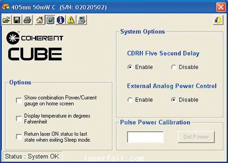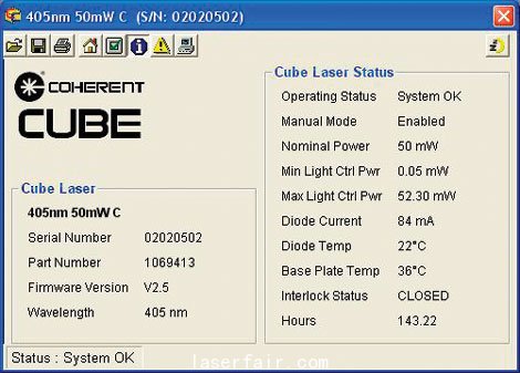 主頁面提供計算機(jī)對CUBE的控制,包括激光器的開關(guān),功率設(shè)置和模式選擇。