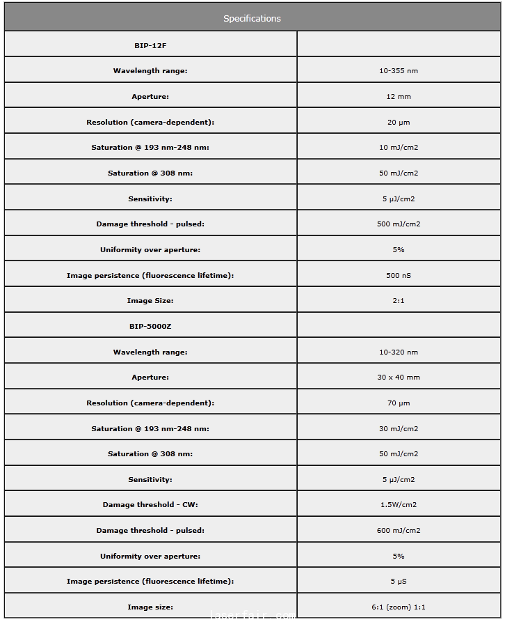 這兩種型號(hào)深紫外光束分析儀采用專利的紫外到可見(jiàn)的熒光轉(zhuǎn)換機(jī)制耦合入射光束到合適的C-Mount相機(jī)。