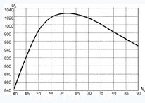 圖5中,橫坐標(biāo)表示變壓器副邊繞組匝數(shù)N2,縱坐標(biāo)表示輸出電壓U0,在L=100μH,Ui=520V,f=20kHz,N2=60時(shí),輸出電壓U0為峰值。