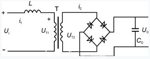 電源系統(tǒng)中,電感L與高頻變壓器T的設(shè)計(jì)是關(guān)鍵。從圖2看出,逆變電路的負(fù)載只有電感L及變壓器T的原邊,當(dāng)功率管導(dǎo)通,直流電壓Ui加于圖4所示位置時(shí),電感上電壓為Ui-UT1,則變壓器原邊電流i1=(Ui-UT1)t/L