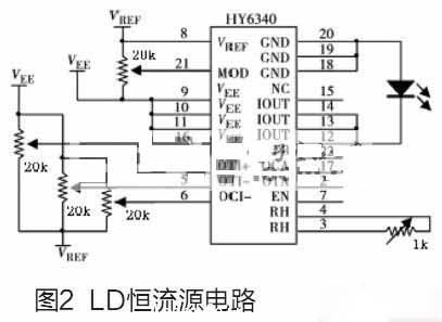 LD供電電路是一個(gè)恒流源(見(jiàn)圖2)。ETC公司恒流源驅(qū)動(dòng)芯片HY*0為核心元件。供電電壓VEE的穩(wěn)定對(duì)輸出恒流信號(hào)的穩(wěn)定起著重要作用,因此采用多重濾波技術(shù),將VEE的紋波控制在lmV以下,保證HY*0芯片輸出端12、13、14引腳信號(hào)的穩(wěn)定。調(diào)節(jié)5引腳和6引腳到VEE之間的電壓可以分別設(shè)定過(guò)流保護(hù)閥值和過(guò)溫保護(hù)值。在恒定電流工作方式下,通過(guò)調(diào)節(jié)21引腳的輸出電平來(lái)控制輸出電流的大小在0~1.5A之間連續(xù)可調(diào)。