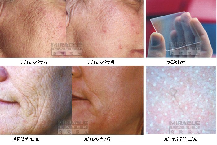 MCL30點陣大師發(fā)出的鉺激光在皮膚打出密集有序的微孔,直接作用于真皮組織。表皮損傷軟小,使患者治療時更舒適,恢復期短。與傳統(tǒng)全面部或大面積治療相比,達到類似的臨床效果,可有效刺激膠原新生,祛除皺紋,緊致皮膚。