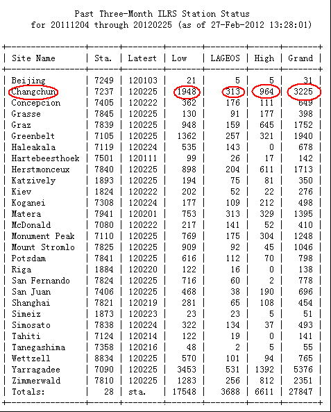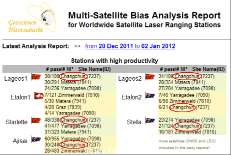 2011年12月,長(zhǎng)春觀測(cè)站單顆衛(wèi)星激光測(cè)量,Lageos1和Lageos2衛(wèi)星及近地衛(wèi)星Starlette測(cè)量名列國(guó)際第一名,遠(yuǎn)地衛(wèi)星Etalon2及近地衛(wèi)星Ajisai、Stella的測(cè)量也名列國(guó)際前三名。