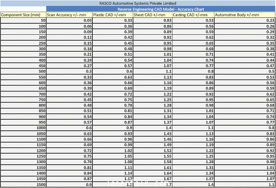 通常情況下根據(jù)形狀和大小的不同,掃描儀1個(gè)零件或組件,RASCO的會(huì)進(jìn)行15~50次掃描,最后使得整體精度在20um到35um之間。掃描一個(gè)整車會(huì)需要更多的時(shí)間,整體精度則會(huì)取決拼接操作的合理性,以下是RASCO采用HDI ADVANCE進(jìn)行不同大小物體掃描可達(dá)到的掃描精度列表。