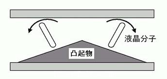 它叫做Protrusion的屋脊?fàn)钔蛊鹞飦硎挂壕П旧懋a(chǎn)生一個預(yù)傾角(Pre-tilt Angle)。這個凸起物頂角的角度越大,則分子長軸的傾斜度就越小。早期的VA模式液晶凸起物只在一側(cè),後期的MVA凸起物則在上下兩端。