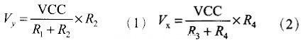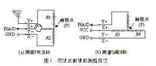 觸摸屏的兩個(gè)金屬導(dǎo)電層分別用來(lái)測(cè)量X軸和Y軸方向的坐標(biāo)。用于X坐標(biāo)測(cè)量的導(dǎo)電層從左右兩端引出兩個(gè)電極,記為X+和X-。用于Y坐標(biāo)測(cè)量的導(dǎo)電層從上下兩端引出兩個(gè)電極,記為Y+和Y-。這就是四線電阻觸摸屏的引線構(gòu)成。當(dāng)在一對(duì)電極上施加電壓時(shí),在該導(dǎo)電層上就會(huì)形成均勻連續(xù)的電壓分布。若在X方向的電極對(duì)上施加一確定的電壓,而Y方向電極對(duì)上不加電壓時(shí),在X平行電壓場(chǎng)中,觸點(diǎn)處的電壓值可以在Y+(或Y-)電極上反映出來(lái),通過(guò)測(cè)量Y+電極對(duì)地的電壓大小,便可得知觸點(diǎn)的X坐標(biāo)值。同理,當(dāng)在Y電極對(duì)上加電壓,而X電極對(duì)上不加電壓時(shí),通過(guò)測(cè)量X+電極的電壓,便可得知觸點(diǎn)的Y坐標(biāo)。測(cè)量原理如圖1所示。