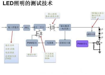 要達(dá)到高品質(zhì)的驅(qū)動電源設(shè)計(jì)標(biāo)準(zhǔn),就需要進(jìn)行全面的測試測量分析,如圖1所示,LED照明測試主要包括5個部分:電源質(zhì)量、諧波、功率開關(guān)器件測量、調(diào)制分析以及驅(qū)動輸出參數(shù)測試。
