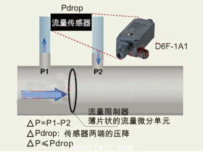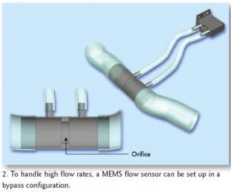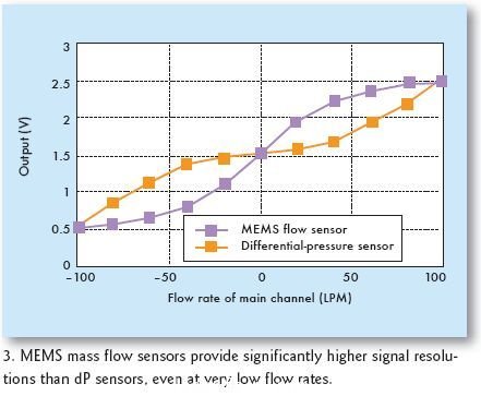 降低成本、減少空間、減輕重量的一個(gè)方法是在旁路通道設(shè)置低流量傳感器來測量主通道上較大的流量。MEMS流量傳感器旁路通道設(shè)置類似于差壓傳感器(間接測量氣體流量,見圖2).。與壓差傳感器相比,MEMS傳感器在很低流量情況下依然可以提供更高的分辨率。圖3描述了普通大流量傳感器與壓差傳感器之間的區(qū)別。在流量接近于零的情況下,壓差曲線變緩,難于判別該位置的流量究竟為零還是為負(fù)。
