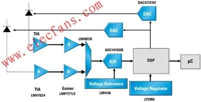 反補償運算放大器最適合使用在電流-電壓轉(zhuǎn)換(跨阻)電路。在醫(yī)療儀器中,其中一個最普遍的應(yīng)用是測量血細胞中的含氧量,稱為SPO2或飽和或外圍氧氣。圖1所示為SPO2模塊的框圖,當(dāng)中的反補償放大器(TIA)用來將來自光二極管的電流轉(zhuǎn)化成電壓。