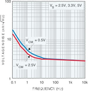 圖 2 LMP7731的輸入電壓噪聲與頻率的關(guān)系頻率、電壓噪聲