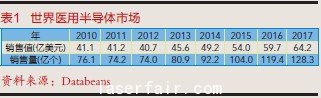市調(diào)公司Databeans最近推出了一份有關(guān)《2012年醫(yī)用半導(dǎo)體》的報告,從另一個角度顯示出醫(yī)療電子市場的利好發(fā)展趨勢。2011~2012年市場由于銷售趨緩而僅保有持平發(fā)展,但自2013年起將因新興經(jīng)濟對保健質(zhì)量要求的提升,發(fā)達地區(qū)則因老齡化發(fā)展而使保健成本增加,醫(yī)用半導(dǎo)體市場將獲得兩位數(shù)的成長,2012~2017年的年均增長率為10%,屆時將達64.2億美元,同期銷售量的年均增長率更達12%,可達到128.3億個(表1)。