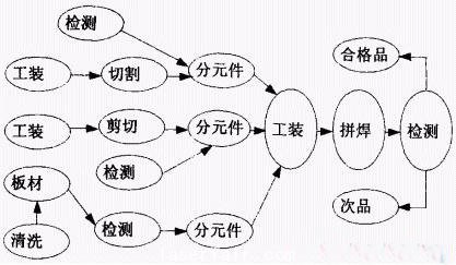 激光拼焊一般由多塊焊板(分元件)經(jīng)工裝、焊接、檢測(cè)等工序得到成品(總元件);而每個(gè)分元件在進(jìn)入焊接加工前,也需要進(jìn)行工裝、切割、檢測(cè)、清洗等工序,得到以總元件加工為總結(jié)點(diǎn)以分步加工為分節(jié)點(diǎn)的有序樹形結(jié)構(gòu),如下圖2所示。#p#分頁標(biāo)題#e#