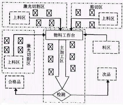 激光拼焊生產(chǎn)線規(guī)劃時(shí),應(yīng)考慮產(chǎn)品質(zhì)量、生產(chǎn)成本、零件加工時(shí)間、工作輔助時(shí)間等多種要素,根據(jù)企業(yè)的經(jīng)營目標(biāo)、生產(chǎn)綱領(lǐng)和車間的特點(diǎn),建立合理的車間物料布局,實(shí)現(xiàn)物流平衡,減輕搬運(yùn)作業(yè),減少庫存時(shí)間,均衡設(shè)備能力和負(fù)荷,將人員、設(shè)備、物料等所需要的空間、時(shí)間做最適當(dāng)?shù)姆峙浜妥钣行У慕M合,獲得最大的生產(chǎn)經(jīng)濟(jì)效益。根據(jù)激光拼焊產(chǎn)品的特點(diǎn)和工藝要求,在實(shí)際的設(shè)計(jì)生產(chǎn)過程中,激光拼焊生產(chǎn)線設(shè)施的布局規(guī)劃采取加工島區(qū)與加工單元結(jié)合的布局原則。按照部件將生產(chǎn)線分解為若干個(gè)加工島區(qū),以拼焊加工島區(qū)為主干,與各相對(duì)獨(dú)立的加工島區(qū)通過耦合關(guān)系構(gòu)成整條生產(chǎn)線;每個(gè)加工島區(qū)內(nèi)部,不同功能的制造單元(工裝、切割、焊接、機(jī)械加工、檢測(cè)等)由具有一定節(jié)拍的輸送/物流連接。激光拼焊產(chǎn)品生產(chǎn)過程中的輸送/物流系統(tǒng),特別是焊前的緩沖區(qū)、焊后的出料物流單元的長度和走向的規(guī)劃與設(shè)計(jì),與前后工序排布乃至整個(gè)生產(chǎn)線的整體布局有密切的關(guān)系。整個(gè)激光拼焊生產(chǎn)線的布局規(guī)劃圖如圖3所示。