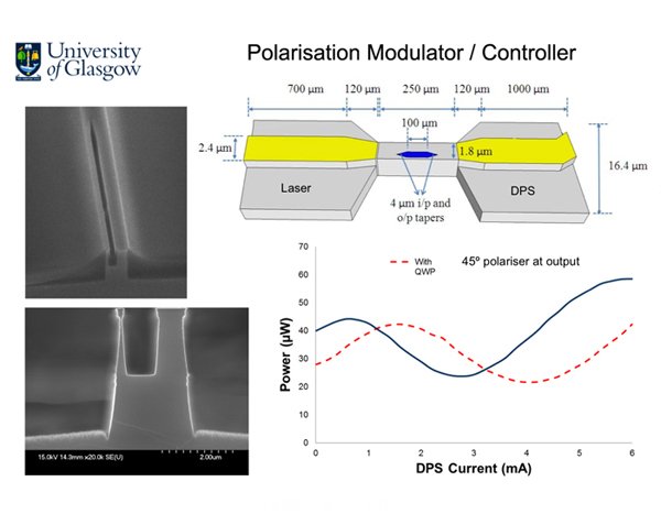 格拉斯哥大學(xué)研究人員開發(fā)出一項(xiàng)新技術(shù),通過片上偏振控制,實(shí)現(xiàn)半導(dǎo)體激光器及相關(guān)器件的批量制造。David Hutchings教授領(lǐng)導(dǎo)的研究小組宣稱,他們的單片集成組件可在納秒時間尺度上通過電路方式將得到的輸出偏振態(tài)轉(zhuǎn)換成任何其他的偏振態(tài),這樣就可人為控制產(chǎn)生所需的輸出偏振態(tài)。