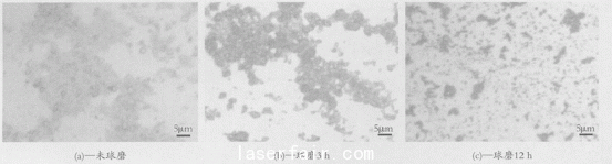 圖1(b)為球磨3h后的粉末顆粒顯微照片。球磨3h后粉末整體體積減小為未球磨時的1/3。由圖1(b)可以看出,粉體顆粒均勻程度大為改善,最大可見粒徑已降至1μm左右。該涂料噴涂層致密,厚度均勻,成型很好。由此得出:球磨改變了涂料性質(zhì),改善了其表面成型能力。圖1(c)是球磨12h后的粉末顆粒顯微照片,由照片可以看出,除團聚外,已看不出顆粒形貌,無法判斷最大顆粒尺寸。說明長時間低能球磨,大大細(xì)化了粉體,且未出現(xiàn)“反粉碎”現(xiàn)象。綜上所述:球磨使粒徑不均勻的粉體細(xì)化、均勻化,大大改善了涂料的噴涂工藝性能及表面成型能力。#p#分頁標(biāo)題#e#
