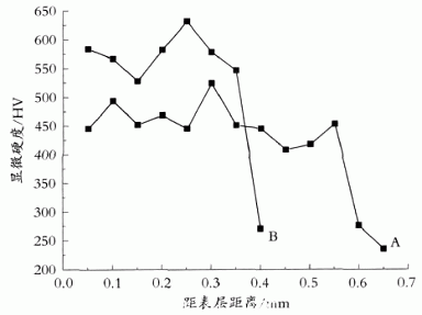 對于試樣A,由于功率較高,冷卻速度較功率低的慢,所以,A的最高硬度較B低。但其硬化層已達(dá)0.55mm厚,對于油管的長期綜合耐磨性能是有利的。綜上所述,本試驗確定的涂料達(dá)到了市售其他涂料的吸光效果,且能滿足工業(yè)激光加工的要求。