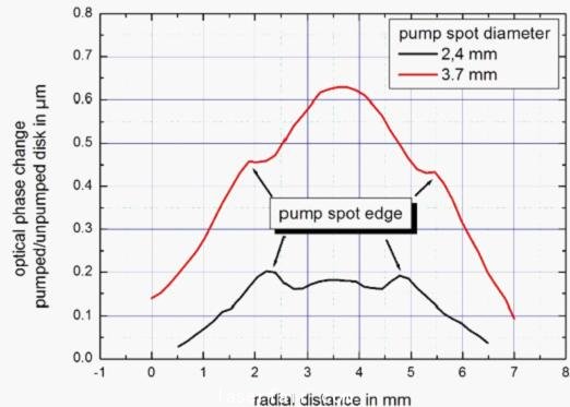 光焦度計(jì)算公式是2/Rcc,Rcc是碟片的曲率半徑。在碟片設(shè)計(jì)時(shí),碟片表面的溫度變化已確定。經(jīng)過(guò)在碟片上反射后,產(chǎn)生非球面的相位分布。下圖表示兩個(gè)碟片外形變化,泵浦功率密度是4KW/cm2。