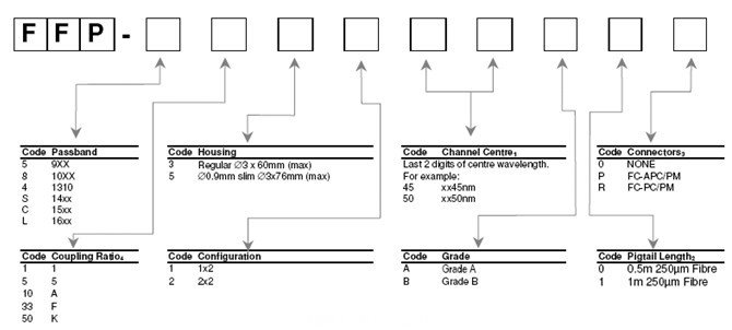 例如: FFP-CK3250A10(C波段,保偏耦合器,50/50耦合率,普通外殼, 2x2,通道中心1550nm,A級(jí),1m尾纖頭,無(wú)連接器)