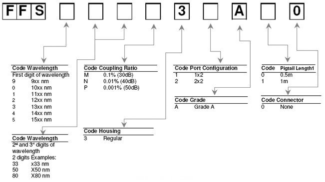 例如:1、FFS-080 P32 A10 (熔融特種光纖耦合器,1080nm,0.001%耦合率,普通外殼,2x2,A級,1m尾纖,無連接器)