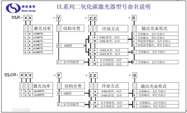 型號:CO2-ULR-XX-Y-ZZ-B (<100W) 或 CO2-ULCR-XXX-Y-ZZ-B (>=100W)