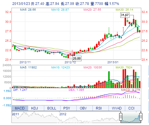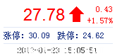 | 今 開: | 27.40 | 成交量: | 7700手 | 振 幅: | 3.11% |