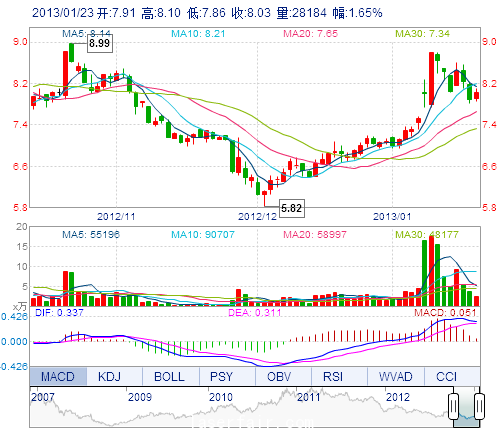 今 開: 7.91 成交量: 2.82萬手 振 幅: 3.04% 最 高: 8.10 成交額: 2247.48萬元 換手率: 1.45% 最 低: 7.86 總市值: 16.00億 市凈率: 3.22 昨 收: 7.90 流通市...