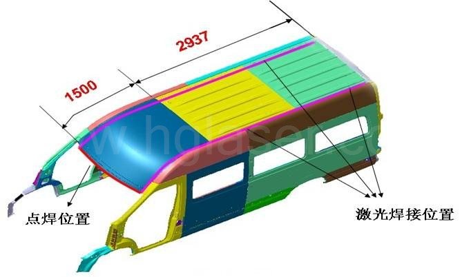 商務車的頂蓋產品結構特點,導致激光焊接面臨著許多難題,包括:M111商用車頂蓋由于使用超長行程薄板,沖壓工序很難保證一致、可控的間隙;有限工位場的設計與施工;超長薄板結構件的焊縫間隙控制、熱變形控制;超長曲線多段焊縫定位和光縫對中問題;如何建立穩(wěn)定的激光與焊絲的位置關系,獲得良好的焊接質量;超長薄板結構件激光填絲熔焊接夾具;可供試焊車少,調試周期短。