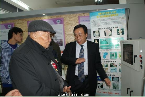 楊永強教授向師昌緒院士(2010年國家最高科學(xué)技術(shù)獎獲得者)介紹DiMetal-100型金屬零件3D打印機及其應(yīng)用。
