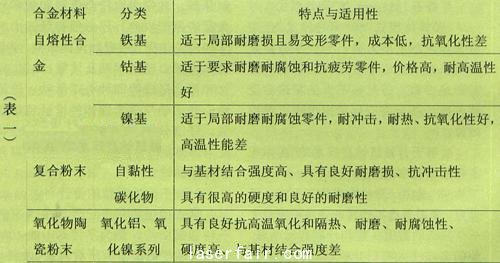 應(yīng)用激光熔覆技術(shù)關(guān)鍵在于涂覆材料的選擇、工藝方法的確定、工藝參數(shù)的選擇。熔覆材料包括自熔性合金材料、復(fù)合材料、陶瓷材料等,這些材料具有優(yōu)異的耐磨、耐腐蝕性能,并通常以粉末的形式使用。各類熔覆材料的性能特點(diǎn)見下表。