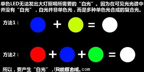 LED合成白光的方法就是我們前面所提及的兩種方式,目前比較普遍的就是使用藍色LED芯片+黃磷熒光粉或黃磷濾色鏡的方式來制成白光LED,現(xiàn)在大量運用于日間行車燈以及用作前大燈的白光LED,使用的都是同樣的原理。白光LED的出現(xiàn)同樣可以載入液晶顯示器的發(fā)展史冊,它為提高液晶顯示器的色彩表現(xiàn)、推動液晶顯示器普及做出了巨大貢獻。