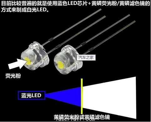 之前的LED是無法發(fā)出大燈照明所需要的“白光”的,因為在可見光光譜當中并沒有“白光”,它并非單色光,而是多種單色光合成的復合光。人眼看到的白光,需要藍色光+黃色光兩種波長光線的混合或是藍色光+綠色光+紅色光三種波長光線的混合(這就是彩電的三基色)。由于這兩種方法都需要藍色光,因此藍光LED就變成了開發(fā)白光LED的重要技術節(jié)點。