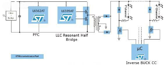 該平臺由兩大部分組成:電源部分與電流控制器。其中,電流控制器是一個數(shù)字電流控制器。電源電路的最大輸出功率達到130W (48V,2.7A),該電路由兩級電路組成:基于L6562AT的前端功率因數(shù)校正器(PFC)和基于L6599ATLLC諧振轉(zhuǎn)換器。